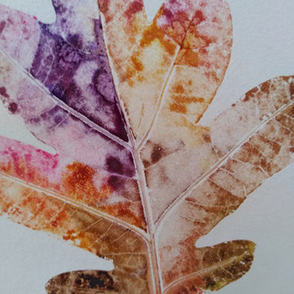 Autumnal colour and the importance of shape was explored further through printing leaves using the printing press. Acrylic paint was added to the surface of assorted leaves. These were placed on dampened paper, covered with a thick blanket and then put through the printing press. A simple and very effective process.