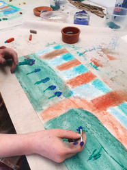 Soft pastels were available to create individual interpretations of a bluebell wood. Soft pastels are messy and need spraying with fixative to ensure motifs do not smudge. Cotton buds, sticks and acrylic paint were used to add the flowers.