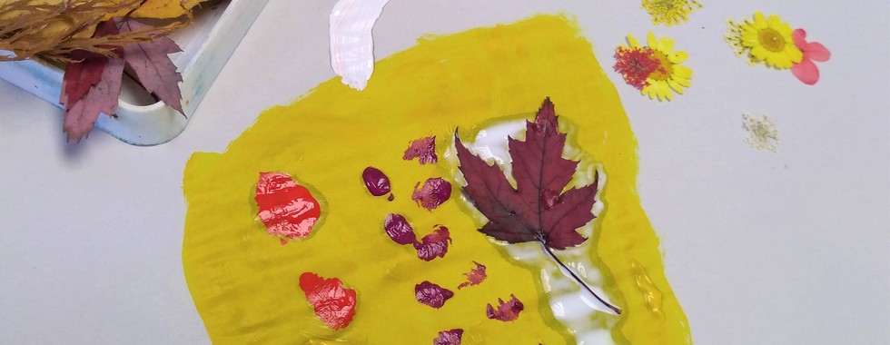 Using thick acrylic paint, pressed leaves and flowers, the children decorated pumpkins ....